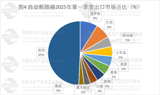 自动断路器是低压配电保护设备,其出口市场较为分散,主要包括俄罗斯(占此类产品出口总额的9%,下同)、巴西(8%)、新加坡(5%)、土耳其(5%)、英国(5%)、越南(5%)等地。行业发展初期,中国的自动断路器制造商通常与海外客户进行OEM或ODM合作,而近年来,企业自主品牌意识增强,越来越多的中国自动断路器品牌登上国际舞台。
