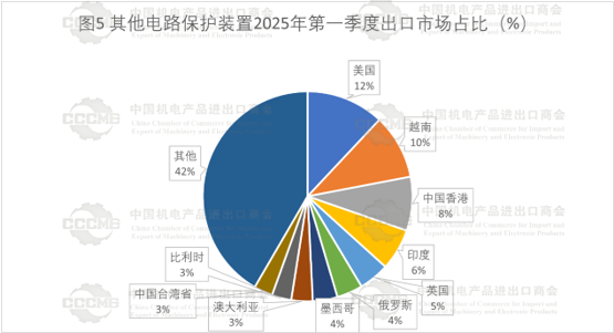 漏电保护器、浪涌保护器等其他电路保护装置出口以美国(12%)、越南(10%)、中国香港(8%)、印度(6%)等市场为主,其中美国作为其第一大市场,2025年第一季度出口额同比下降16.5%,降幅明显。
