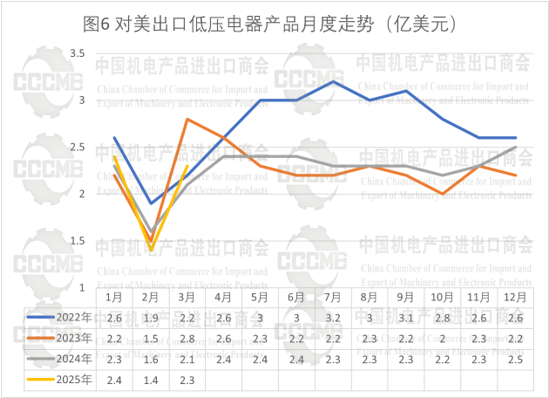 从出口月度趋势看,2025年1-3月,我低压电器行业对美出口额有所下滑,其中2月出口额仅1.4亿美元,为近三年最低水平。尽管受美加征关税影响,但据中国机电商会了解,部分低压电器企业通过与客户协商分担成本的策略,暂时缓解了关税压力,同时依托自身产品技术优势,短期内稳住了市场需求。此外,企业还积极布局新产品开发和拓展新市场,借助广交会等重要平台,吸引了更多拉丁美洲、非洲等新兴市场的客户,为企业带来了新的业务机遇。