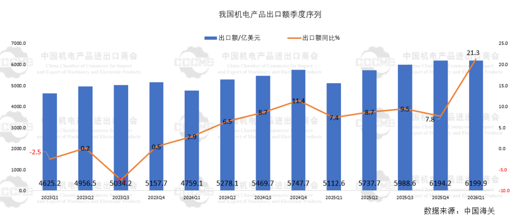 海关总署统计,2026年一季度我国机电产品进出口值同比增长22.4%至9010.1亿美元。其中,出口创6199.9亿美元的季度新高,同比增长21.4%,拉动全商品出口增长12.8个百分点;进口2810.2亿美元,同比增长24.9%,拉动全商品进口增长9.6个百分点;贸易顺差同比增长18.6%至3389.7亿美元,高出全商品顺差746.3亿美元。
