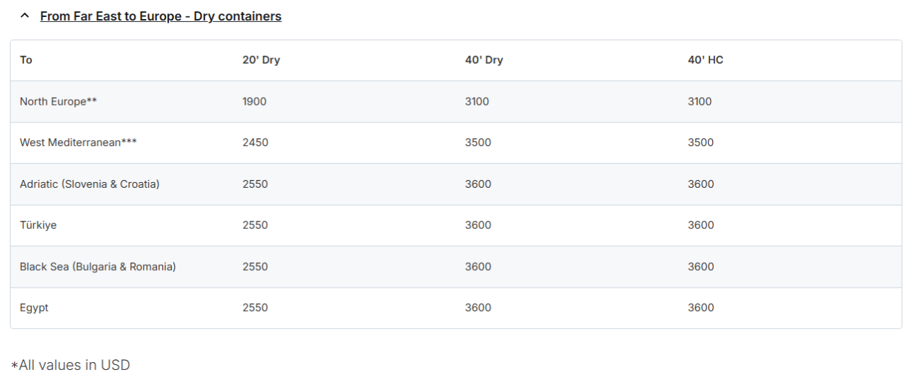 其中,MSC宣布,自2025年11月15日起生效(直至另行通知,但不超过2025年11月30日),从所有远东港口(包括但不限于日本、韩国及东南亚的港口)至北欧、地中海(包括西地中海、东地中海、亚得里亚海及北非)和黑海港口,将实施以下新的运费费率。