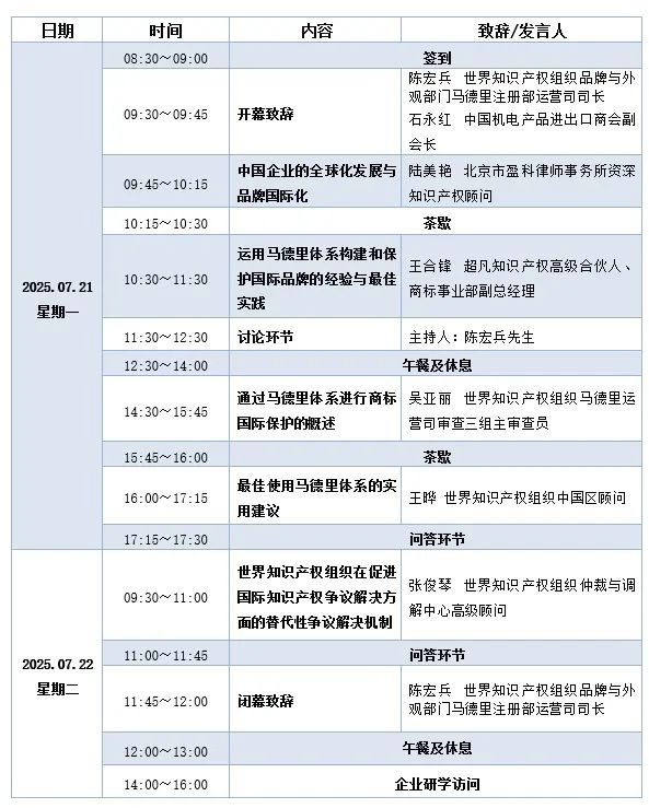 为帮助企业突破国际商标布局瓶颈,提升跨境知识产权争议应对能力,中国机电产品进出口商会(“中国机电商会”)联合世界知识产权组织(“WIPO”)共同举办本次专题培训会。本次培训会将围绕马德里国际商标注册体系的最新规则、申请实务、风险防控及WIPO替代性争议解决机制展开,通过政策解读、案例剖析与互动答疑,为企业提供可落地的国际化知识产权解决方案。具体通知如下: