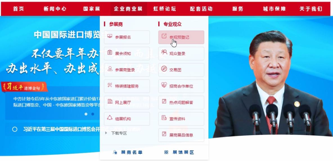 登录第五届中国国际进口博览会官网 https://www.ciie.org,点击网页上方“企业商业展”→“参观预登记”,进入注册界面。