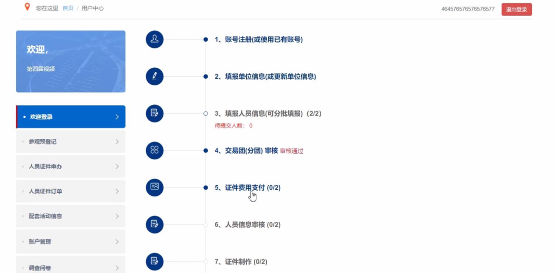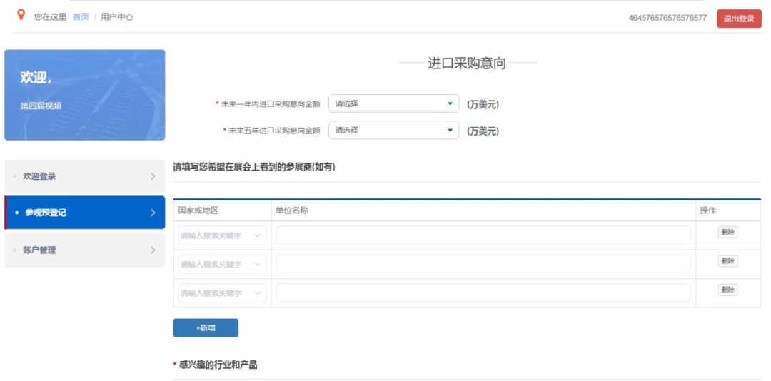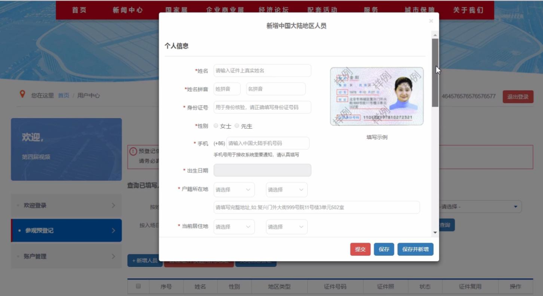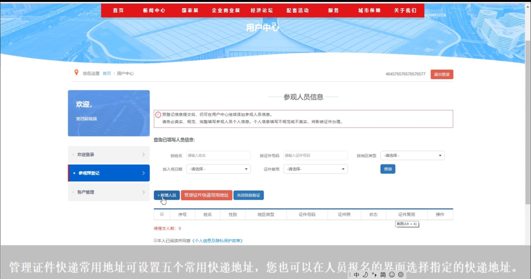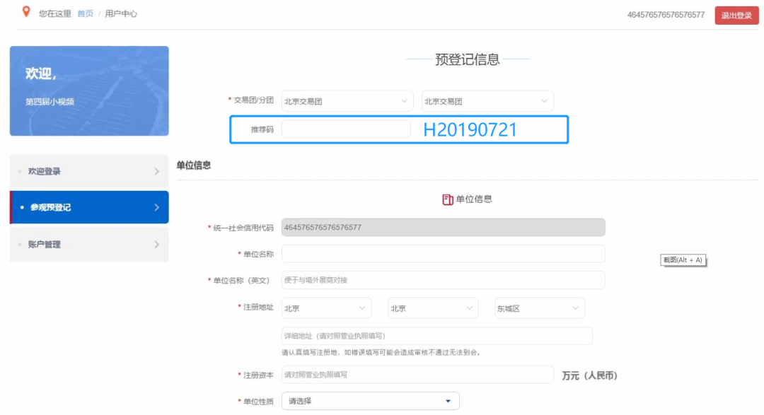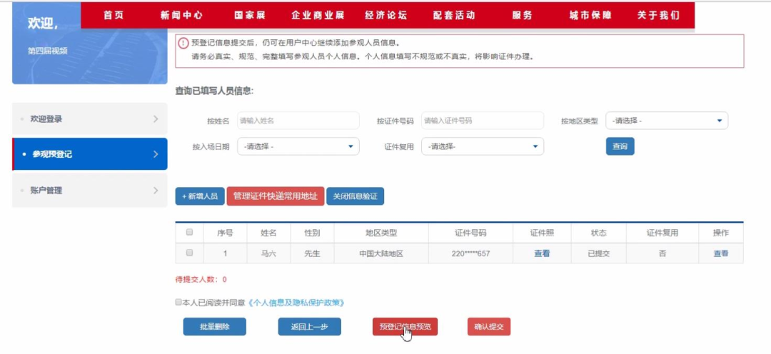 登录成功后自动跳转至用户中心,请选择左侧“参观预登记”进入预登记信息界面,填写企业信息。