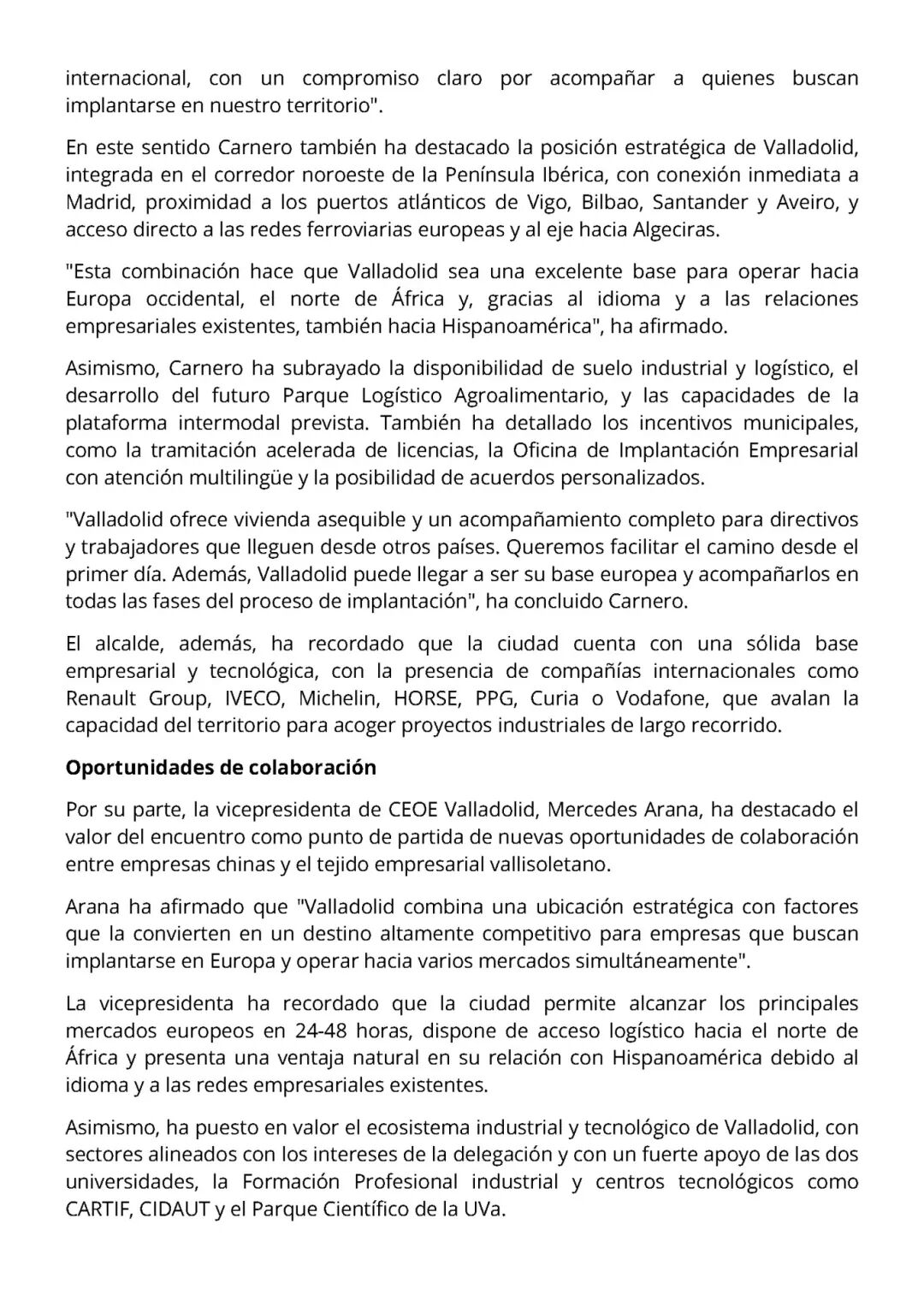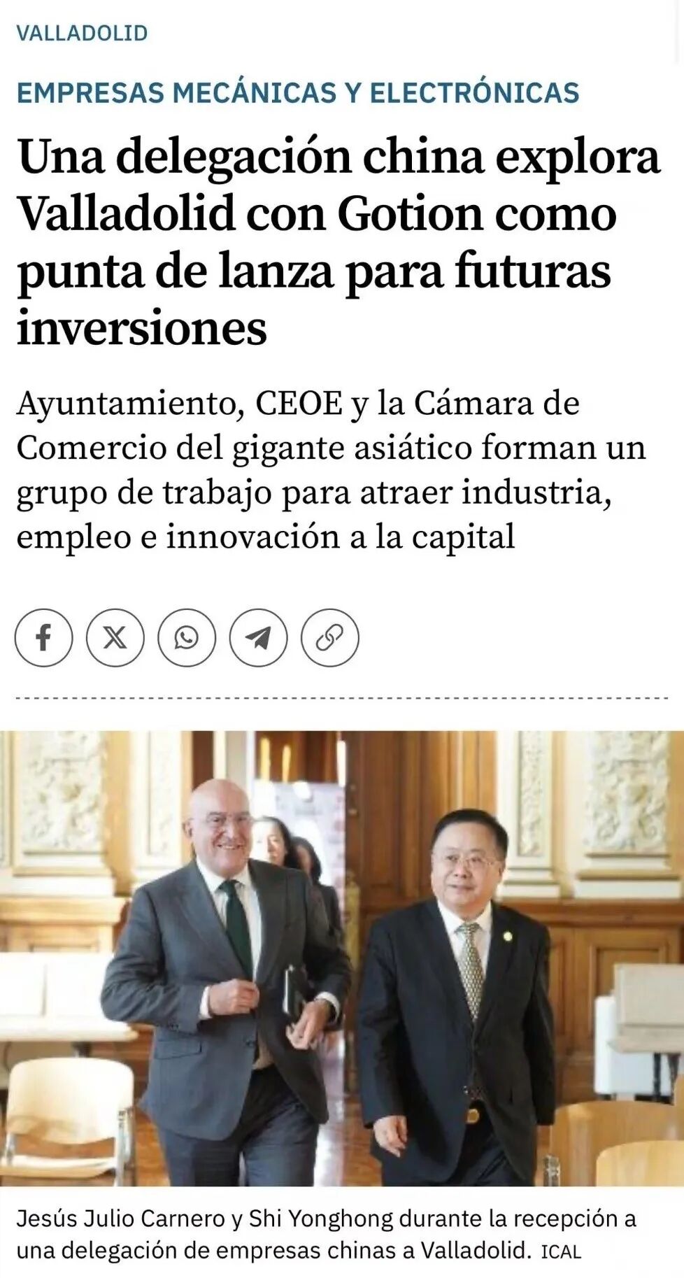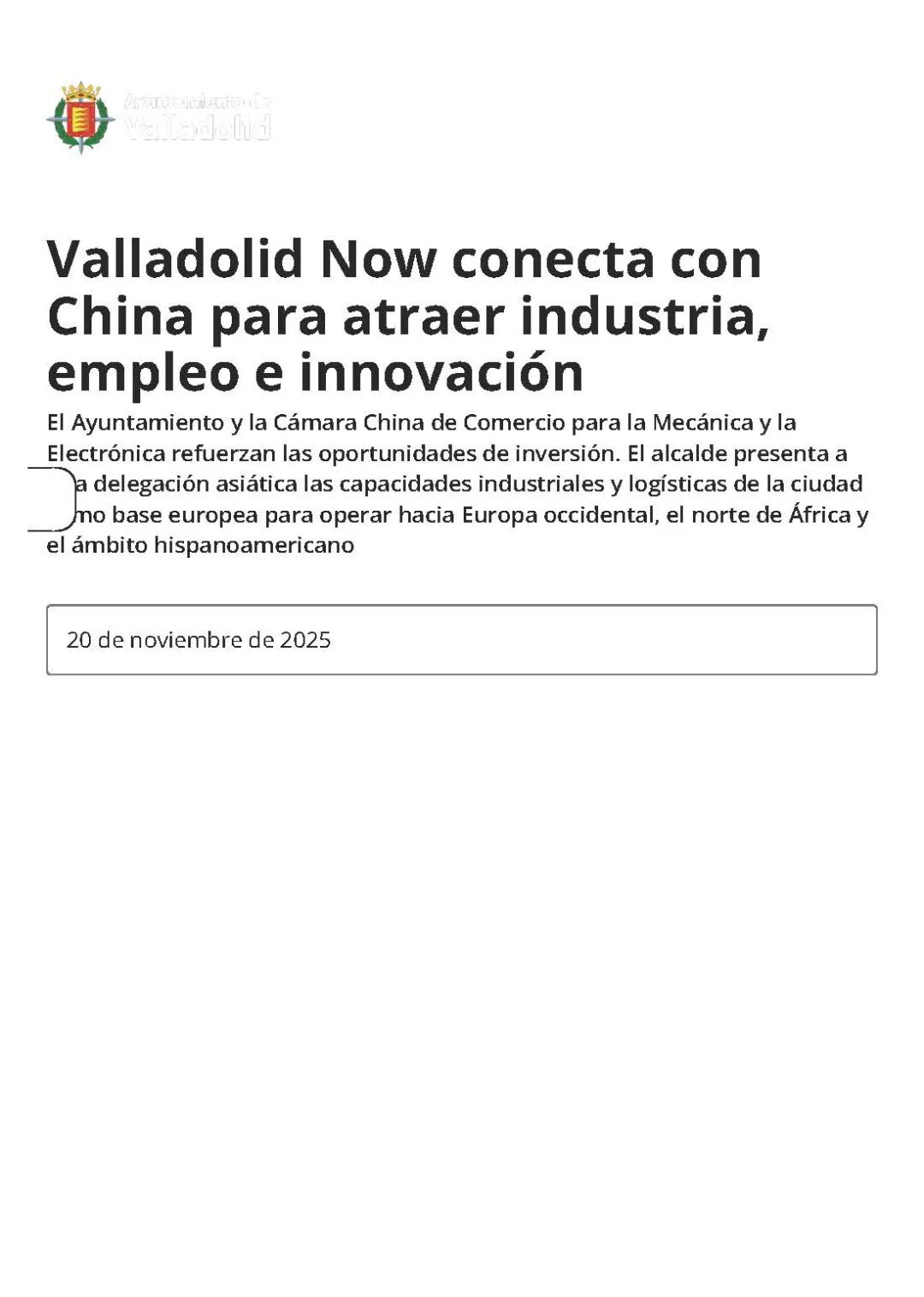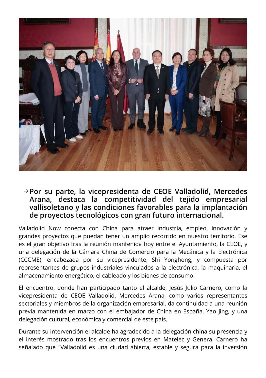 11月20日,中国机电商会副会长石永红率团拜访巴利亚多利德市政府,与市长赫苏斯・胡里奥・卡内罗及政府创新和经济部部长等市政府官员举行会谈。石永红副会长表示,此次访问深入了解了巴利亚多利德汽车产业基础与引资优势,中国机电商会愿与巴市政府、CEOE分会共建合作团队,搭建企业对接平台,推动务实项目落地。胡里奥市长表示,巴利亚多利德拥有优越区位、丰富人才资源,产业覆盖汽车、新能源、电子科技及农业食品等领域,是开放安全的投资目的地,也是进入西欧与北非市场的战略枢纽,市政府将联合CEOE为中国企业提供政策支持。阿拉娜副主席介绍,巴利亚多利德注重人才培养,轨道交通发达,新建货运铁路将为企业带来物流、仓储投资机遇,本次会谈是双方合作的新起点。